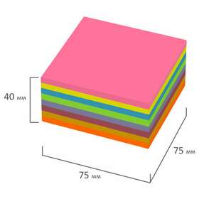 Стикеры 8 неоновых цветов (розовый, желтый, голубой, зеленый, фиолетовый, красный, мандариновый и оранжевый) повышенной клейкости в форме куба 75х75 мм состоят из 400 листов. Плотность бумаги составляет 75 г/м2. Клейкий слой - 55 Н/м. Легко клеятся к любой поверхности. Не оставляют следов. Упакованы в полиэтиленовую пленку.
