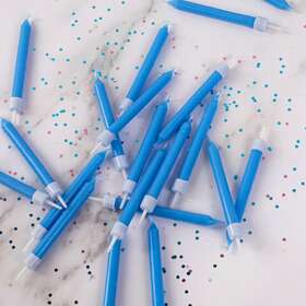 В состав набора входят 20 свечей голубого цвета. Выполнены из парафина и укомплектованы пластиковыми держателями для удобства размещения в торте или другом кондитерском изделии. Высота свечи - 8 см, толщина - 0,7 см.