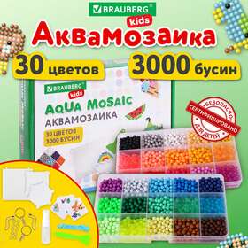 В набор входят бусины 30 различных цветов, около 100 штук каждого цвета, 2 пластиковых контейнера с отсеками для удобного хранения бусин, 3 подставки-трафарета, 14 двусторонних карточек с картинками, бутылочка-пульверизатор для воды, специальная ручка для аквамозаики, лопатка для снятия готовой фигурки с трафарета, а также основы для браслета и других украшений, колечки и крепления для создания брелков, подвесок и других игрушек из бусин.