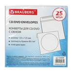 Конверты для CD/DVD (125х125 мм) с окном, бумажные, клей декстрин, КОМПЛЕКТ 25 шт., BRAUBERG, 123599