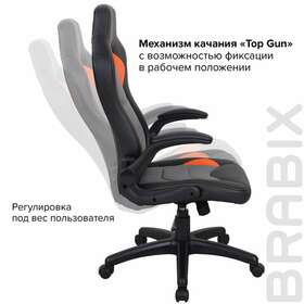 Кресло оснащено механизмом качания «топ-ган» с регулировкой под вес пользователя и возможностью фиксации в рабочем положении.
