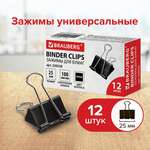 Зажимы для бумаг BRAUBERG, КОМПЛЕКТ 12 шт., 25 мм, на 100 листов, черные, картонная коробка, 220558