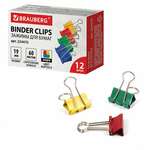 Зажимы для бумаг BRAUBERG, КОМПЛЕКТ 12 шт., 19 мм, на 60 листов, цветные, картонная коробка, 224470