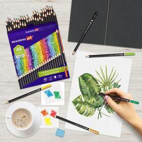 Набор состоит из 48 ярких цветов. Круглая форма сечения и матовый корпус позволяют удобно держать карандаши в руке. Древесина ценных пород и качество исполнения гарантируют легкую заточку. Благодаря высококачественному грифелю диаметром 3,3 мм рисунок ложится густой и четкой линией, обеспечивая бархатистую поверхность. Мягкий грифель дает мягкость нанесения и насыщенные цвета, позволяя легко смешивать различные оттенки. Все карандаши заточены и поставляются в плотной картонной упаковке с европодвесом.