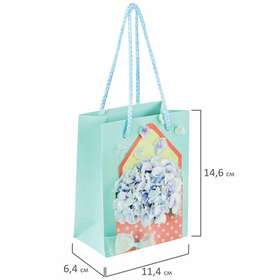 Изготовлен из ламинированного мелованного картона с веревочными ручками из полипропилена. Размер - 11,4x6,4x14,6 см. Пакет выполнен в светлых тонах с изображением летних цветов. С лицевой стороны пакета некоторые детали покрыты глиттером.